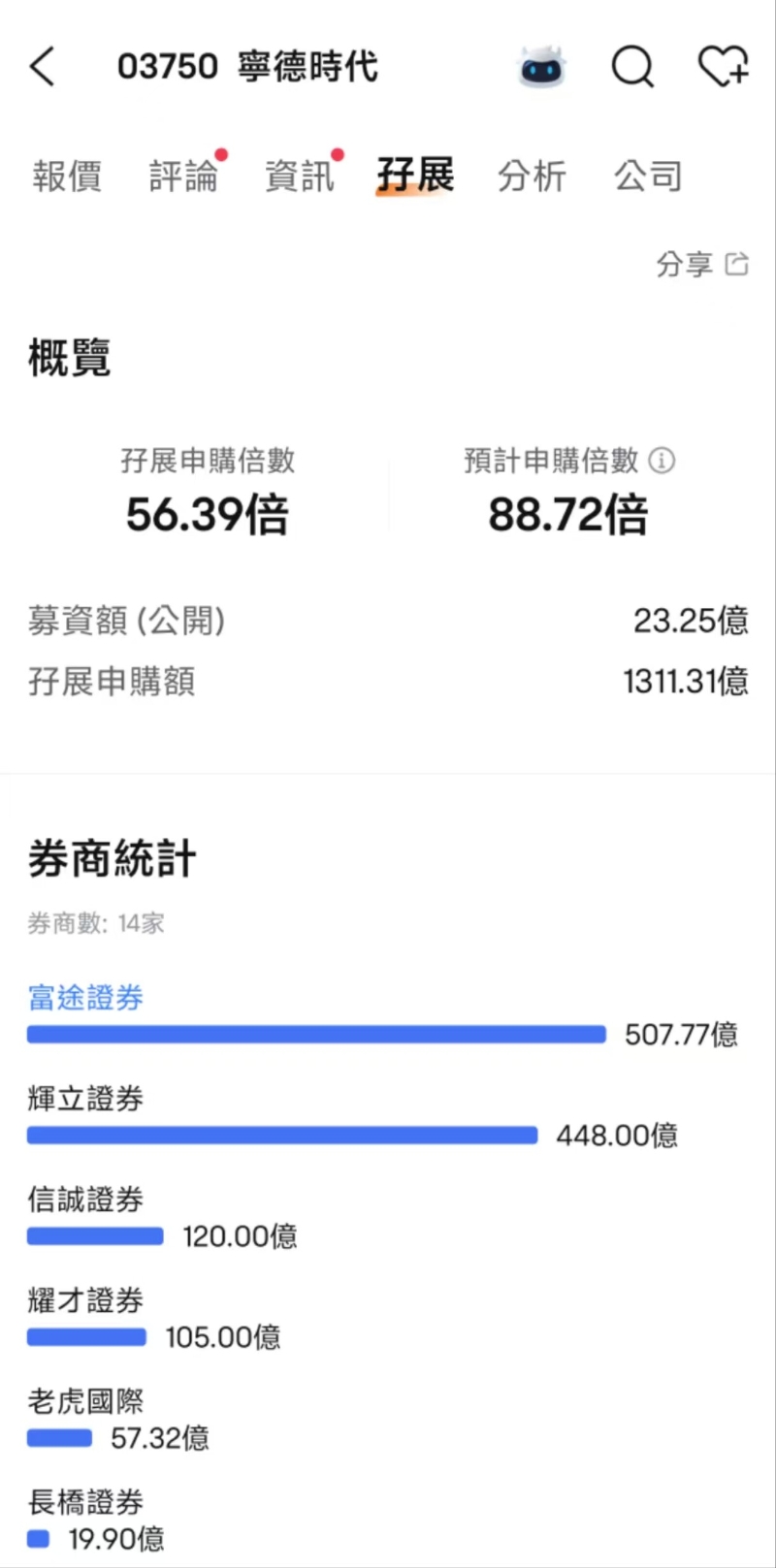 香港新聞網5月14日電 內地新能源汽車電池製造商寧德時代12日起至15日正式於香港招股,綜合券商數據,截至14日上午約9時,寧德時代最新已獲券商借出逾1311億港元孖展,以公開發售額23.25億港元計,超購約56倍。