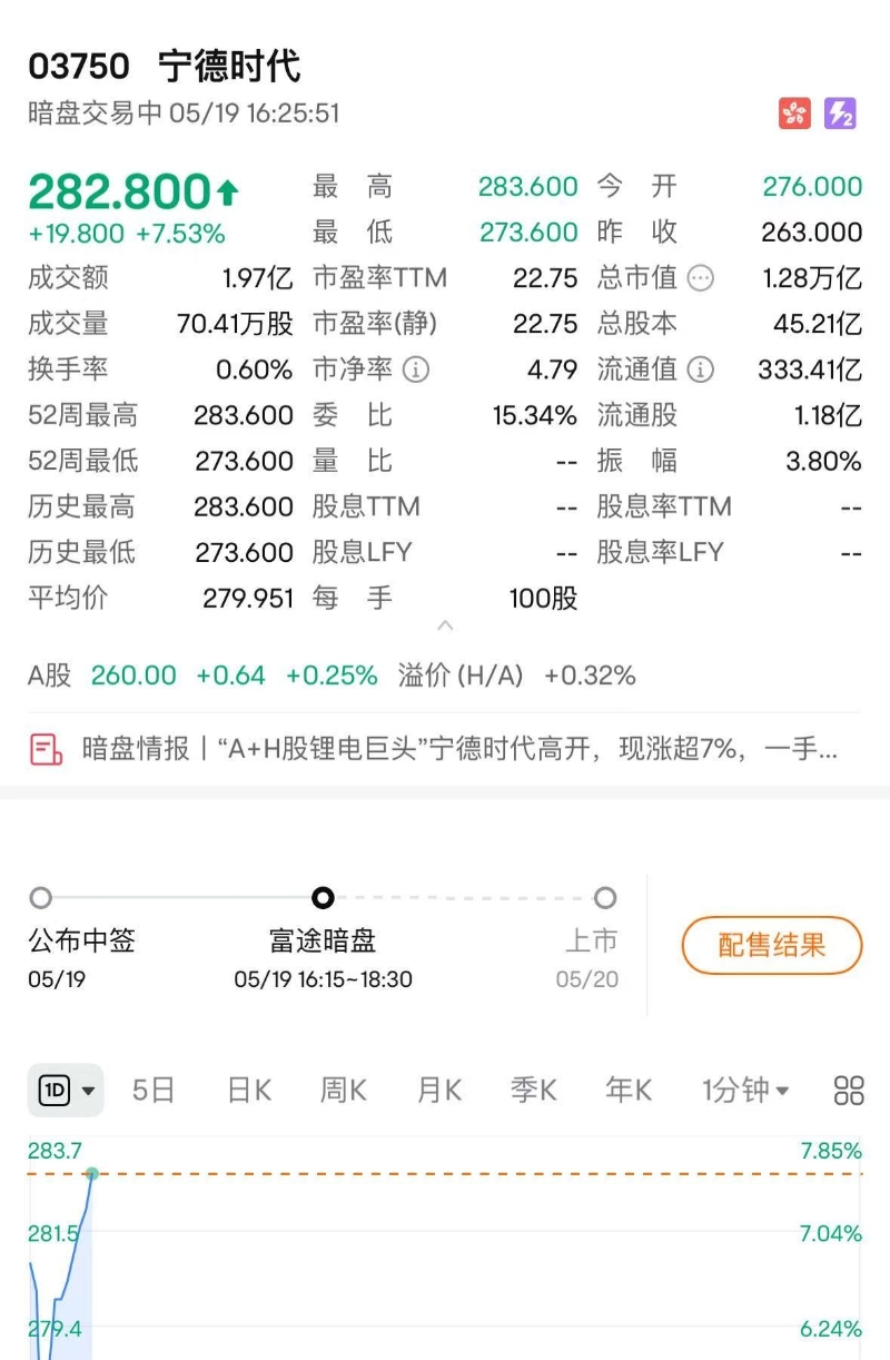 香港新聞網5月19日電  內地電動車電池龍頭寧德時代還於20日掛牌,19日暗盤交易受關注。發售價定為263元港幣的寧德時代,在主要券商的暗盤均升超過5%,其中富途證券開市報281元港幣,以每手100股計,獲分派寧德時代股份的投資者帳面賺1800元港幣。其後股價曾回落至277港幣,不久後強勢上升至284港幣,暫錄近8%的升幅。