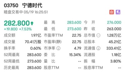 寧德時代香港IPO以263港元定價,該新股集資王暗盤交易表現理想,於輝立交易場,19日暗盤最高見288港元,至交易結束,最新報286.8港元,較定價高出23.8港元或9.02%。