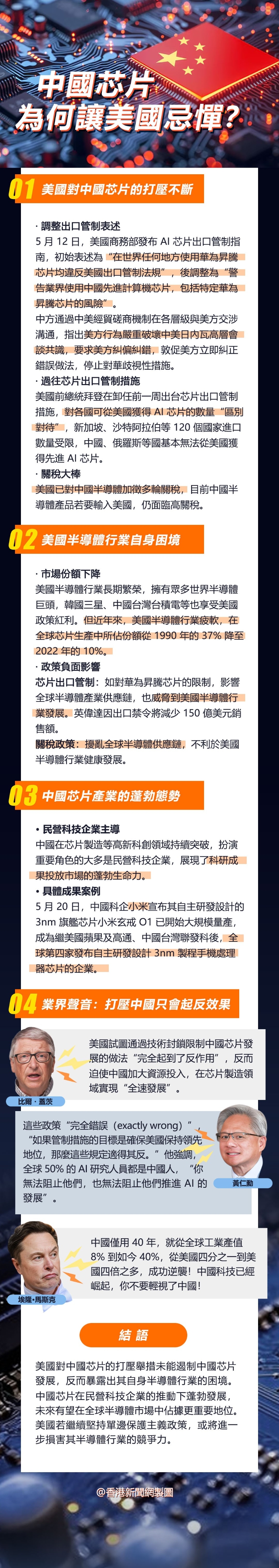 香港新聞網5月21日電 美國長期打壓中國半導體行業,近期又針對華為昇騰等中國芯片出台出口管制法規。美國“全方位封鎖”與中國“造芯”蓬勃發展形成鮮明對比,那麼,中國芯片究竟為何讓美國如此忌憚?一圖讓您看懂: