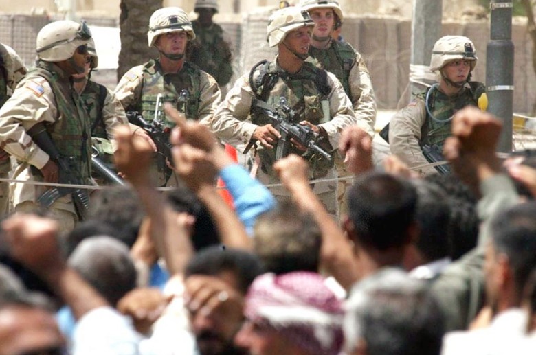 美國一直是中東亂局始作俑者。2003年6月18日,美軍士兵在伊拉克首都巴格達美英聯軍臨時總部門前持槍面對數百名示威的伊拉克人。資料圖  新華社記者趙建偉攝