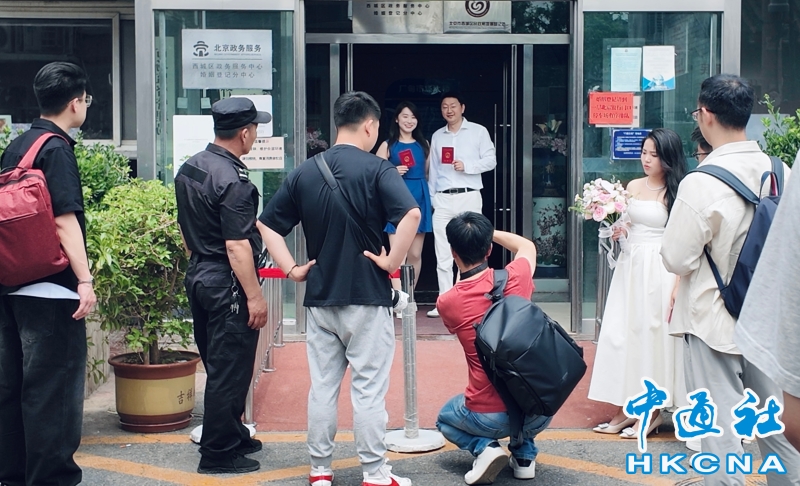 •     北京市西城區民政局結婚登記處入口,新人在拍照留念。 香港中通社圖片