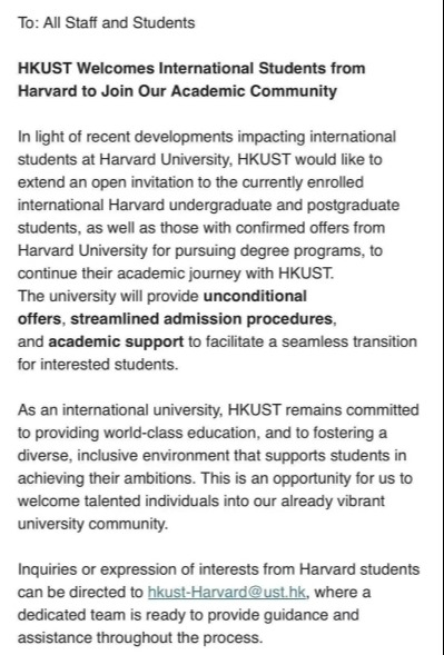 香港中通社5月23日電(香港中通社記者 譚暢)美國宣佈取消哈佛大學獲得的學生和交流學者項目資質,禁止該校招收國際學生,現有學生亦需轉學。學業被唐突中斷,學生何去何從?在世界百強高校佔據五席之地的香港,拋出了橄欖枝。 就哈佛被禁停收國際生報道,香港有留學顧問指,23日接獲不少家長的查詢電話,了解相關情況。針對該事件,香港高校當機立斷,為留美學生啟動“轉學直通車”,保障學業不間斷。 香港科技大學當天上午率先發文,誠邀目前就讀於哈佛大學的國際本科生和研究生,及已獲得哈佛學位課程確認錄取的學生,到科大繼續深造;科大將提供無條件錄取、簡化的入學程序和學術支持,讓學生“無縫銜接”新學習環境。 香港嶺南大學隨後亦表示,面對國際人才流動的機遇,歡迎有興趣的哈佛大學國際學生加入嶺南大家庭,並為他們啟動“轉學直通車”。嶺大還附申請網頁,包括本科專用網頁、入學資訊、研究生課程申請網頁等,以便轉校生了解申請資訊。 香港理工大學回覆中通社查詢時表示,歡迎已獲得哈佛大學或其他美國頂尖大學錄取通知或在讀的學生,考慮選擇到理大繼續他們的本科或研究生學業。 轉校可能面臨的諸多問題,如簽證、學分轉換等,又該如何應對?