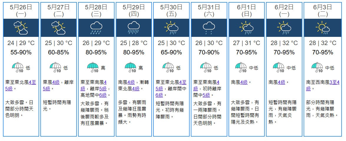 香港地區未來9日天氣預報。香港天文台2025年5月26日截圖 【編輯:豐悅】