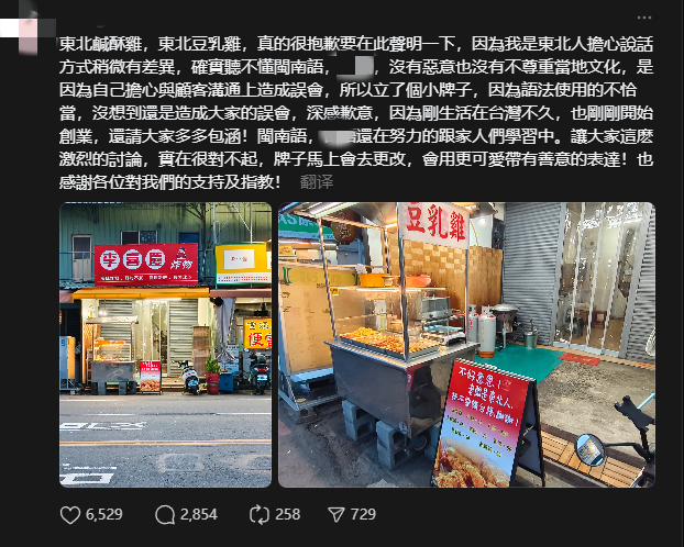 引發爭議後,李姓老闆在社交媒體Threads發文,解釋他沒有不尊重閩南語,只是剛來台灣生活沒多久,還在學習中,於是立一個告示牌以便更好服務顧客。“讓大家這麼激烈的討論,實在很對不起,牌子馬上會去更改,會用更可愛帶有善意的表達,也感謝各位對我們的支持及指教”。