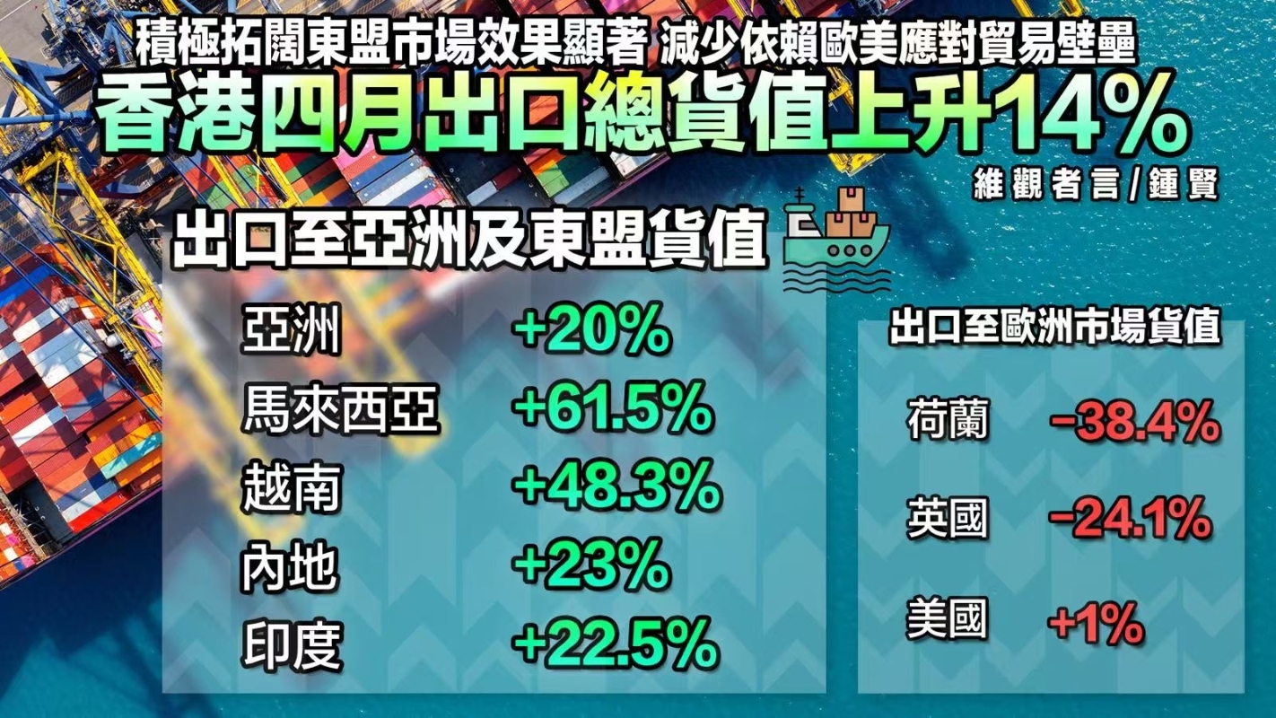 香港新聞網5月29日電 香港特區政府統計處數據最新數據顯示,4月份香港整體出口按年上升14.7%,當中出口至亞洲及東盟國家錄得顯著升幅。相反,美國3月消費物價指數自2020年5月以來首次錄得按月下跌,首季本地生產總值自2022年以來按年率計首次收縮。有評論文章認為,這正好說明關稅“七傷拳對美國零售業的遺害,亦充分反映香港高瞻遠矚,成功開拓新興市場。 數據會說話,從香港4月份出口數據可以看出新興市場和傳統市場的變化。其中,對整個亞洲增長20%、對馬來西亞上升61.5%、越南上升48.3%、內地市場上升23%,而印度亦上升22.5%。同時,香港亦減少對歐美市場的依賴,對荷蘭出口下跌38.4%、英國下跌24.1%、美國僅微升1%。