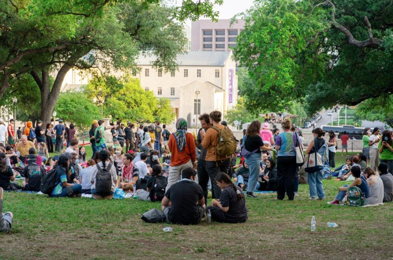 2024年4月24日,人們在美國得克薩斯大學奧斯汀分校校園里舉行集會。新華社發