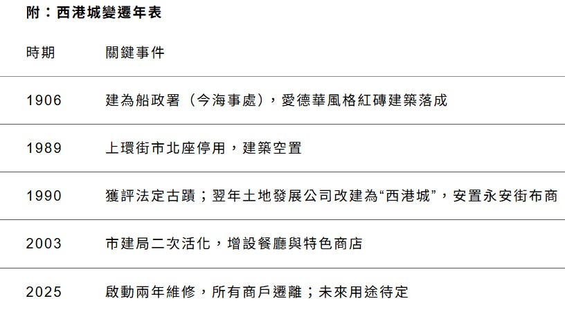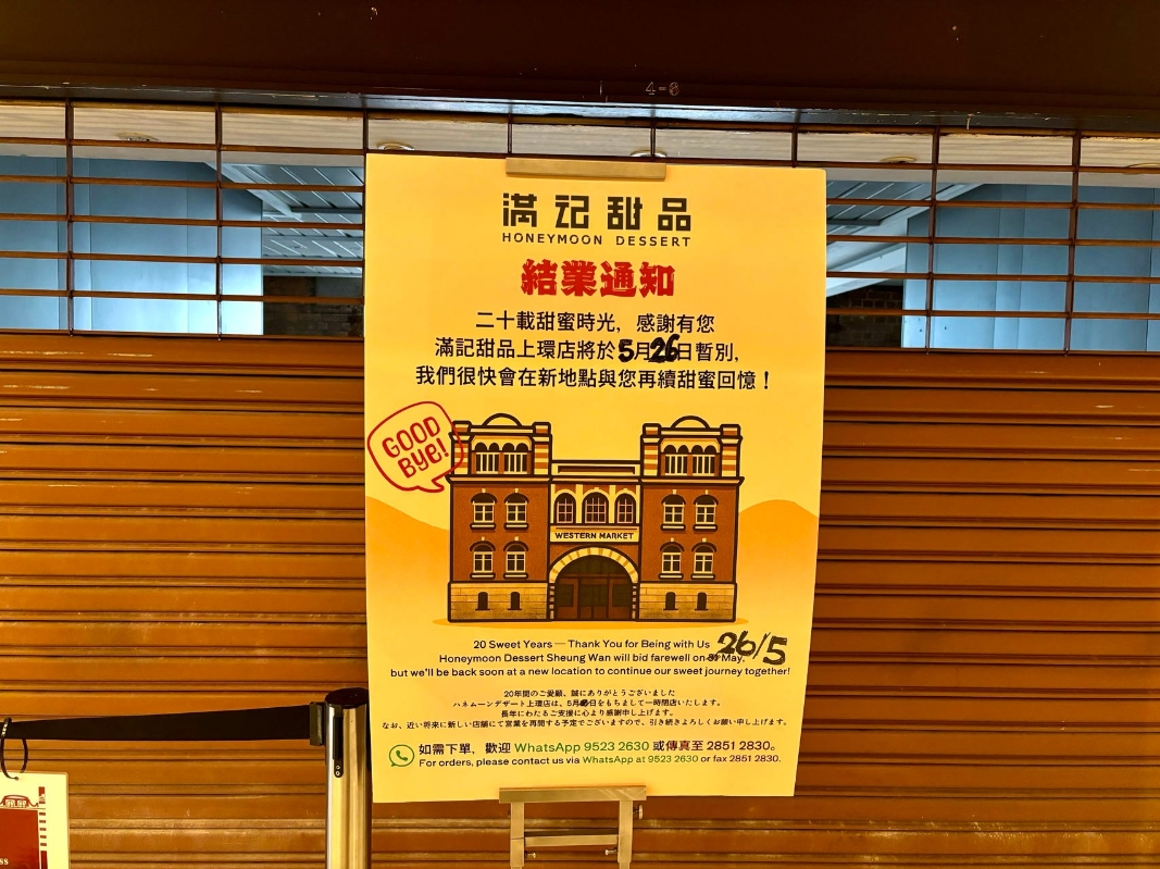在西港城營業20年的滿記甜品於5月26日結業,表示“很快會在新地點與您再續甜蜜回憶!”(香港中通社記者 黃璇攝) 更深層的矛盾在於土地契約的博弈:政府於1991年批給市建局21年管理期早已屆滿,經多次短期延續後,2025年維修完成時契約將正式終止。發展局僅稱“會與市建局商討未來用途”,布商能否重回原址仍是未知之數。 西港城的困境,折射出香港古蹟保育的結構性難題。2003年西港城活化後引入餐廳與工藝品店,但未能與周邊海味街、摩羅街等產生協同效應。市民李先生直言:“若只得小舖頭,行人買杯咖啡就走,商戶難以生存。”1991年安置布商,本意是延續“花布街”文化脈絡,但近年市建局傾向引進高租金業態。布商透露復修後“將改變定位”,傳統產業或將邊緣化。