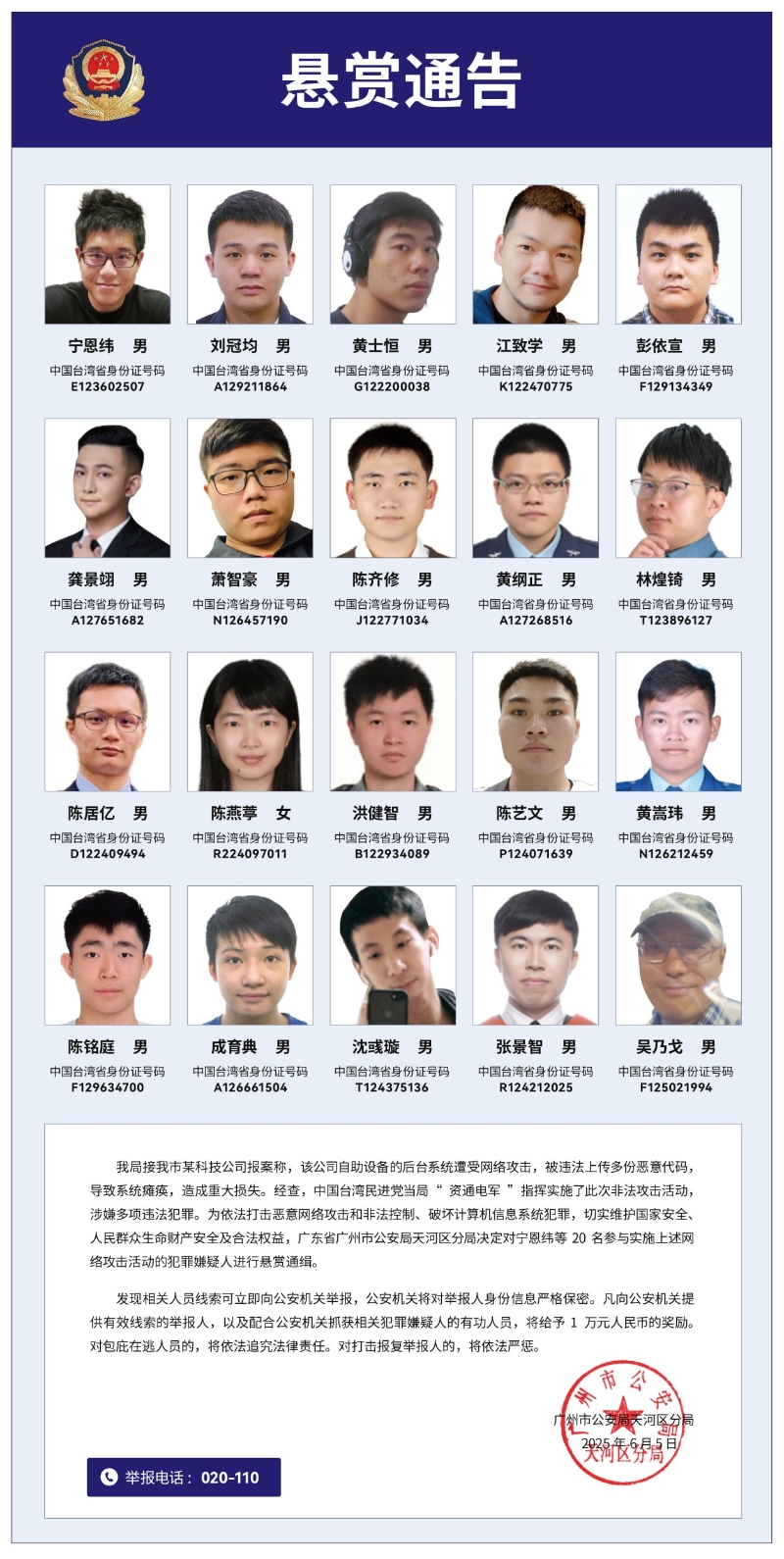 大陸公安機關通緝台灣“資通電軍”20名犯罪嫌疑人香港新聞網6月5日電 6月5日,中國廣東省廣州市公安局天河區分局發布《懸賞通告》,向社會詳細公布中國台灣民進黨當局“資通電軍”指揮實施了此次非法網絡攻擊活動,涉嫌多項違法犯罪,并對寧恩緯等20名參與實施上述網絡攻擊活動的首要犯罪嫌疑人進行懸賞通緝。 這是大陸政府部門首次通過執法行動對“台獨”分裂勢力亮劍,首次對台灣“資通電軍”有組織網絡違法犯罪行為的集中打擊,一舉查實20名犯罪嫌疑人真實身份,全面固定犯罪證據并公開懸賞通緝。