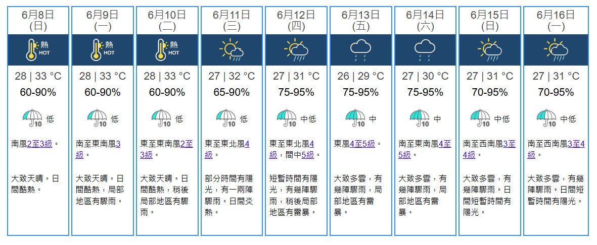 未來9天香港天氣預報。香港天文台網站截圖 香港天文台提示,長者、孕婦、嬰兒及小童、慢性病如心臟病或高血壓患者,以及過胖人士均較易中暑,應及時觀察是否出現中暑徵兆。 在炎熱天氣下或高溫環境中工作的人士,請參照勞工處的預防工作時中暑指引,採取所需的防暑措施。 在戶外活動的人士,應多補充水分和不要過度勞累。於感覺不適時,應儘快到陰涼的地方休息。戶外活動宜安排在早上或下午較後的時間進行。 在室內活動時,亦應適時補充水分。如室內沒有空調設備,應儘量打開窗戶及以風扇保持空氣流通,亦可使用可供避暑的公共設施。 避免長時間在陽光下曝曬,以免受太陽紫外線曬傷。應穿上淺色和通爽衣服,配戴可遮掩後頸的闊邊帽子和能阻隔紫外線的太陽眼鏡。 最好選擇防曬系數(SPF)30或以上的廣譜及防水的防曬產品並大量塗抹,如需長時間在戶外逗留,或在游泳、流汗或以毛巾抹身後,謹記須每兩小時再次塗上防曬產品。 請關注長者或慢性病患者的健康狀況。如認識他們,請間中致電或探訪他們,並留意他們住所的通風及空氣調節設備是否運作正常。 較易中暑人士應儘量避免戶外活動,遠離高溫環境,到陰涼、通風或有空氣調節的地方。(完)