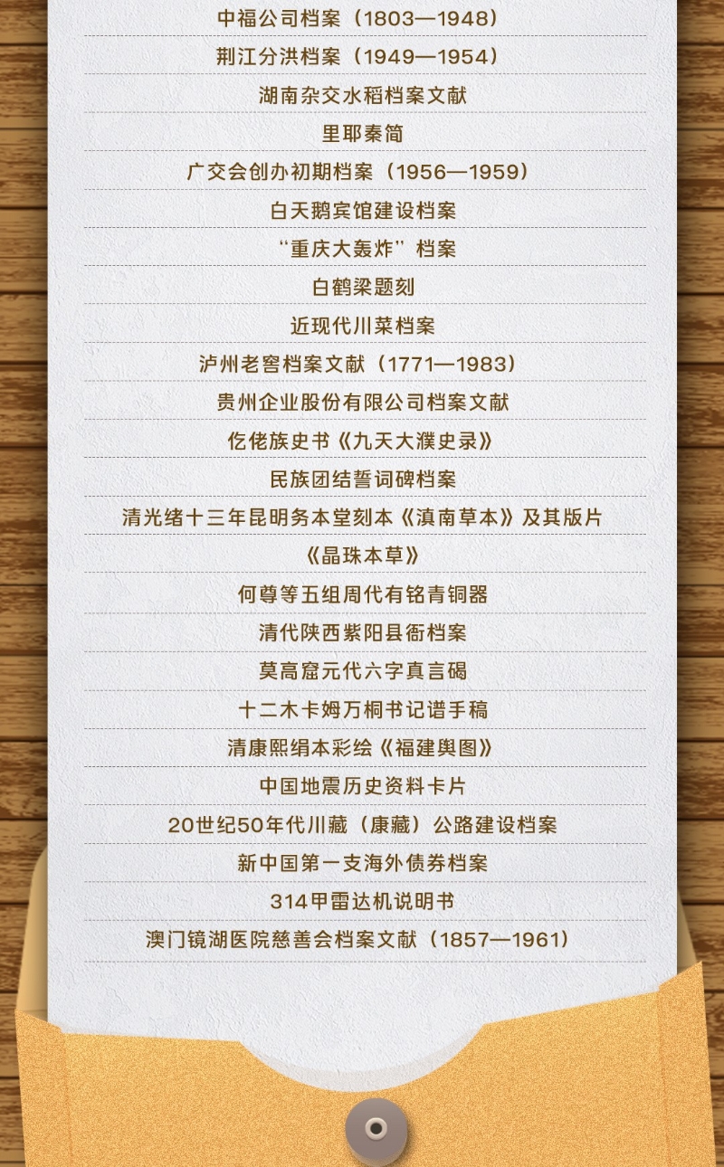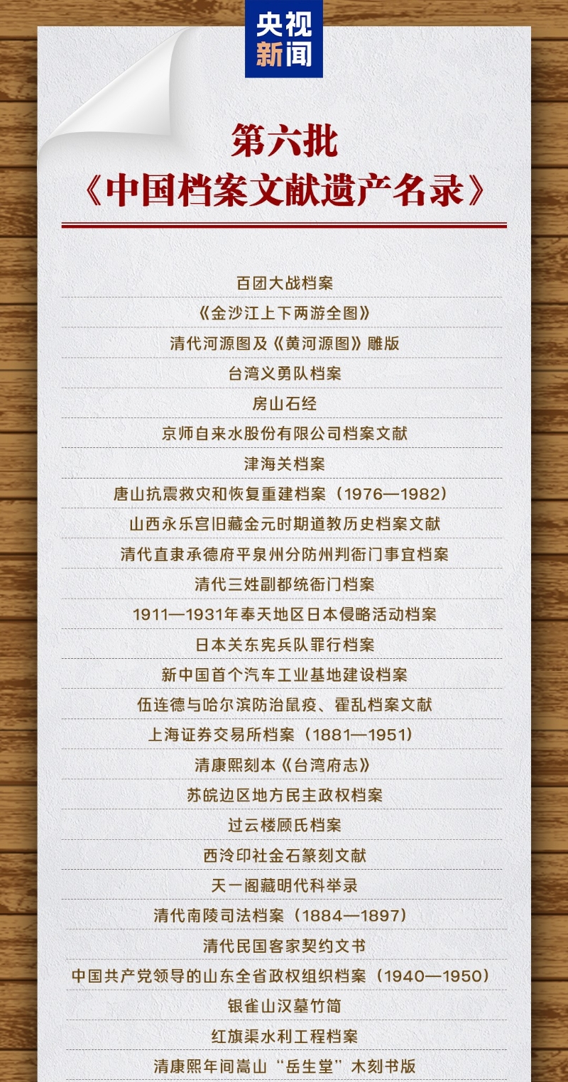 香港中通社6月9日電 6月9日,第18個國際檔案日,中國國家檔案局在北京公布第六批《中國檔案文獻遺產名錄》入選項目。其中包括《百團大戰檔案》、《“重慶大轟炸”檔案》、《湖南雜交水稻檔案》文獻等52個項目。
