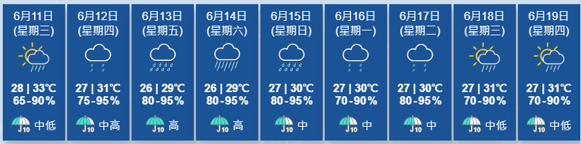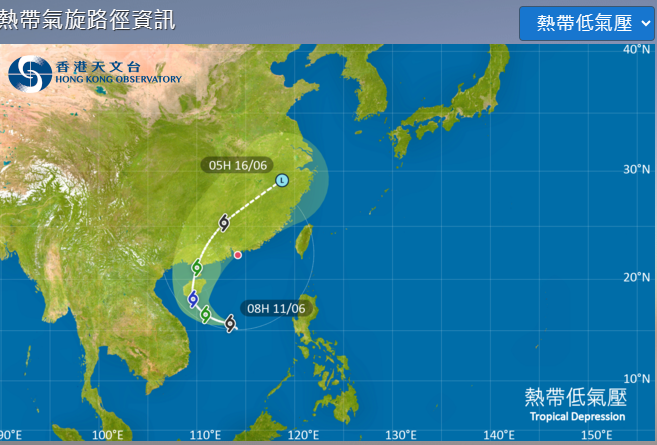 熱帶氣旋路徑。(圖源:香港天文台) 據天文台9:45最新發佈的消息,按照現時預測路徑,“蝴蝶”今日(6月11日)仍與本港保持約700公里距離,預料本港今日尚未普遍吹強風,但與其相關的外圍雨帶正影響南海北部及廣東沿岸。一號戒備信號會在今日大部分時間維持。預料“蝴蝶”會在未來一兩日逐漸增強並大致移向海南島,隨後移至廣東西部沿岸一帶。天文台會視乎其強度、與本港的距離及本地風力變化,評估是否需要在明日(6月12日)稍後至星期五(6月13日)改發三號強風信號。