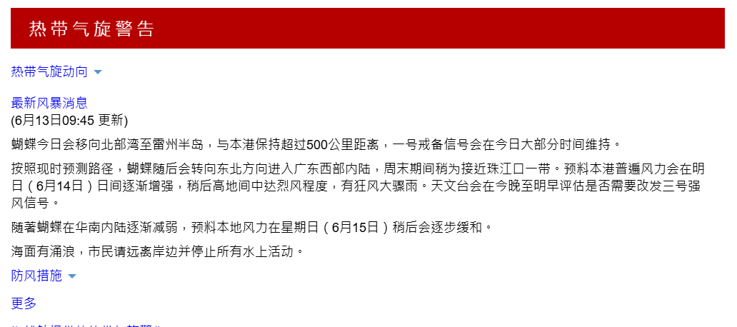 香港新聞網6月13日電 香港天文台13日表示,一號戒備信號會在當日大部分時間維持,天文台會於13日晚上至14日早上評估是否需要改發三號強風信號。