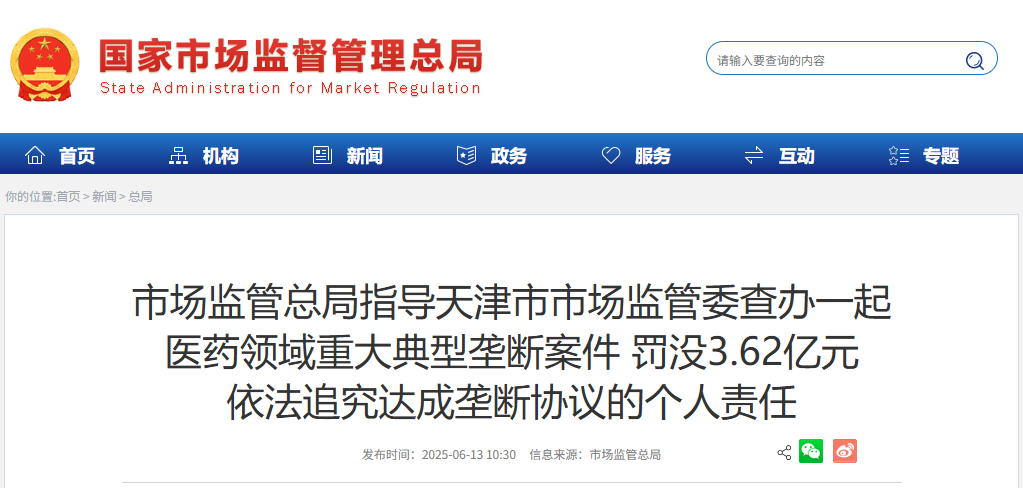 中國市場監管總局官網截圖 據介紹,近日,根據中國國家市場監管總局指定管轄,天津市市場監管委依法對自然人郭某某組織津藥藥業股份有限公司、浙江仙琚製藥股份有限公司、江蘇聯環藥業股份有限公司、西安國康瑞金製藥有限公司達成並實施價格壟斷協議作出行政處罰,罰沒款合計3.62億元,並對達成壟斷協議負有個人責任的人員依法追究法律責任。 2024年4月,天津市市場監管委對該案立案調查。經查,2021年11月起,自然人郭某某通過溝通聯絡、組織聚會、實地走訪等方式,與4家企業相關人員商討提高地塞米松磷酸鈉原料藥價格,達成停止價格競爭、共同漲價的口頭協議,4家企業隨後同步停止對外供貨,造成市場供應緊張,並按照口頭協議共同提高價格。2022年2月至2024年3月,4家企業將地塞米松磷酸鈉原料藥銷售價格從8000元/公斤上漲到1.3萬元/公斤,排除、限制了市場競爭,造成地塞米松磷酸鈉原料藥和相關制劑價格上漲,損害消費者合法利益和社會公共利益。