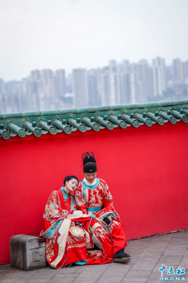 市民穿著中式婚服拍照,紅牆後是現代城市,仿若穿越