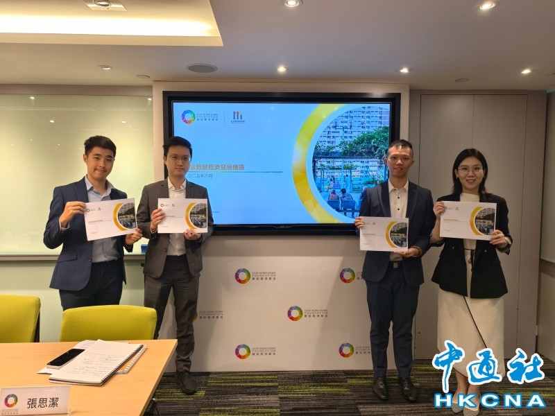 團結香港基金副總裁兼公共政策研究院執行總監葉文祺(左二)連同該機構醫療及社會創新研究主管周嘉俊(左三)接受中通社等傳媒採訪