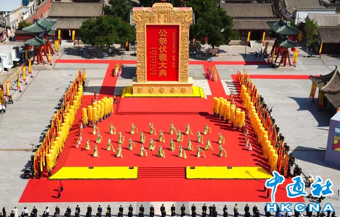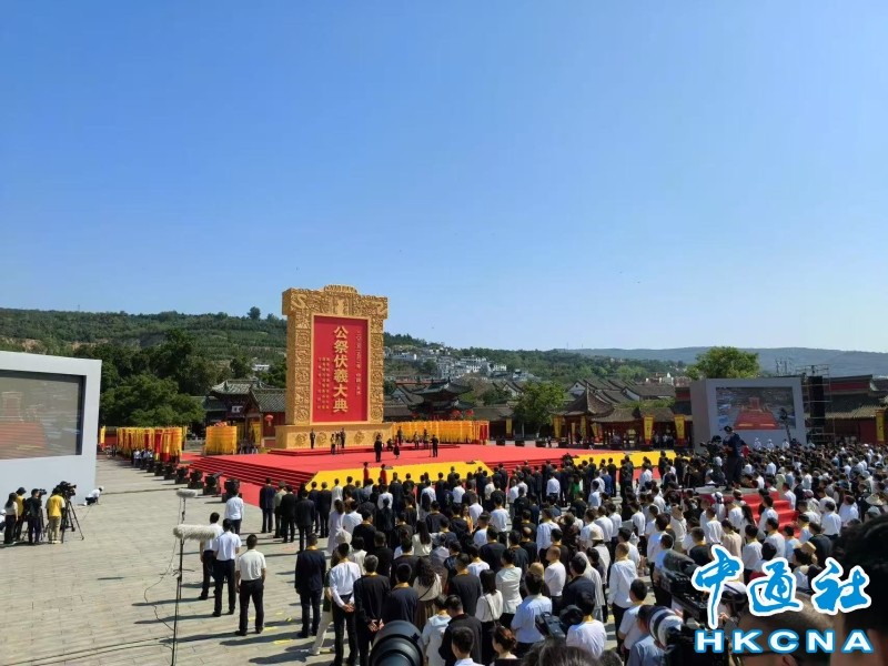 香港中通社圖片 隴山蒼蒼,渭水泱泱。上午9時50分,公祭伏羲大典在天水伏羲廣場正式開始。樂起,擊鼓鳴鐘。鼓聲雄渾,鐘鳴悠遠。恭讀祭文畢,全體行三鞠躬禮,表達對人文始祖的崇高敬仰。台下,手舉龍旗寶蓋的儀仗隊分列兩側;台上,手持高香、八卦鼓的舞者們聚合穿插、次第組合,迎接著來自海內外尋根祭祖的華夏兒女。全程莊嚴肅穆。