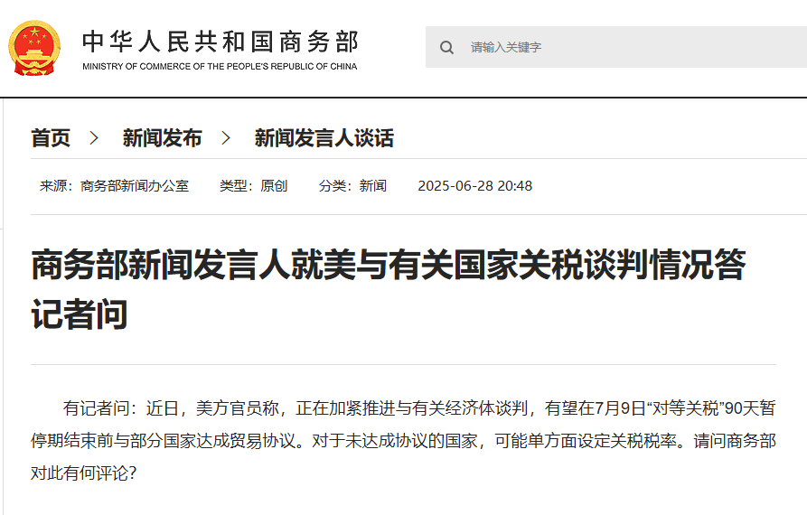 中國商務部官網 據中國商務部官網消息,新聞發言人表示,今年4月以來,美國對全球貿易夥伴加徵所謂“對等關稅”,這是典型的單邊霸凌做法,嚴重衝擊多邊貿易體制,嚴重破壞正常國際貿易秩序。對此,中方一直堅決反對。實踐證明,只有堅定捍衛原則立場,才能真正維護自身合法權益。 發言人指出,中方樂見各方通過平等磋商解決與美方經貿分歧。同時,呼籲各方應始終站在公平正義的一邊,站在歷史正確的一邊,堅決捍衛國際經貿規則和多邊貿易體制。中方堅決反對任何一方以犧牲中方利益為代價達成交易,換取所謂關稅減免。如果出現這種情況,中方絕不接受,將堅決予以反制,維護自身正當權益。 美方官員近日稱,正在加緊推進與有關經濟體談判,有望在7月9日“對等關稅”90天暫停期結束前與部分國家達成貿易協議。對於未達成協議的國家,可能單方面設定關稅稅率。(完) 【編輯:紀東】