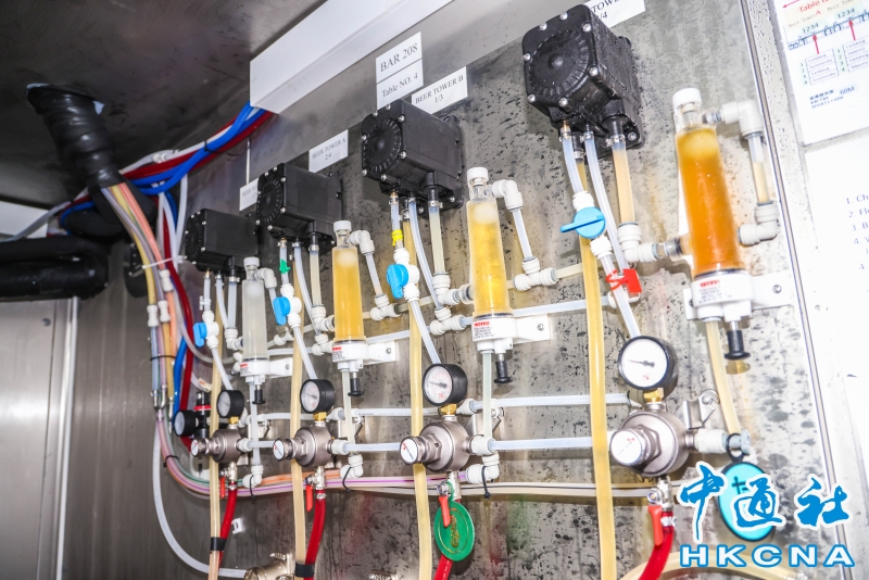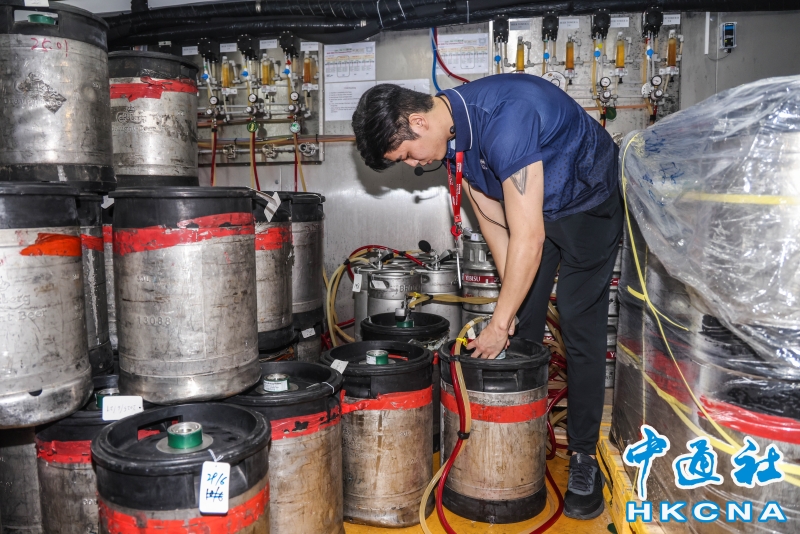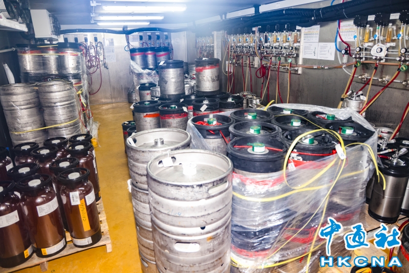 位於香港啟德主場館二樓東大廳的運動酒吧“The Champion”,將於7月5日正式開幕。“The Champion”靈感來自前啟德機場,設計以金色為主調,象徵著金牌的榮耀,配以特色條紋玻璃和舊式航班信息翻頁顯示板的裝飾。“The Champion”的運動酒吧吧枱雙面設計長約100 米,配備64個啤酒龍頭,供應9款精選啤酒和2款招牌特色雞尾酒;酒吧配備12個全天候控溫啤酒庫存,最多可儲存1800桶共約54000公升啤酒;同時提供多種娛樂設施,包括8條電子飛鏢賽道、2張美式桌球枱及2張桌上足球機,7月底將新增2部一級方程式模擬駕駛器,為賽車迷帶來沉浸式體驗。圖為啤酒儲存庫。(香港中通社記者 曹文毓攝) 香港中通社圖片