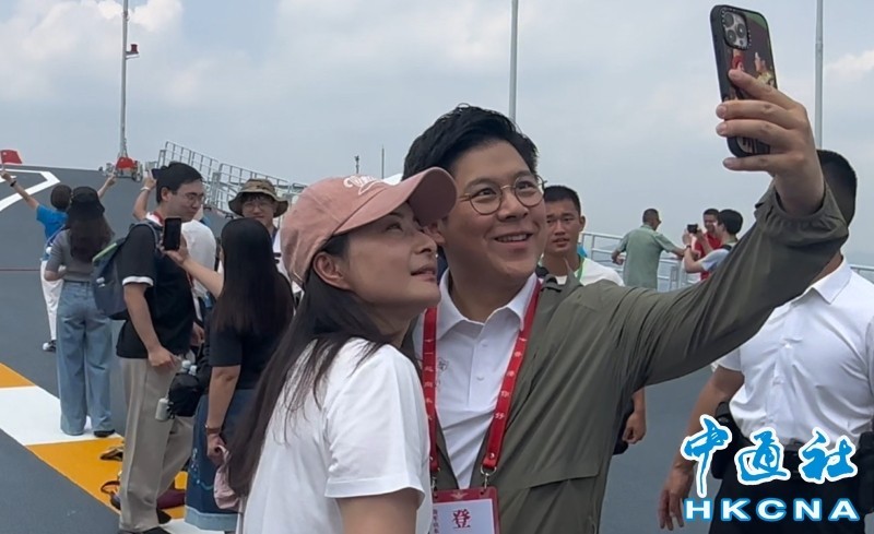 一眾師生在甲板上合力拉起一幅巨型的國旗。來源:香港商報 7月4日,山東艦編隊安排數間香港中學的老師和學生登艦參觀,并與官兵交流。一眾師生在甲板上合力拉起一幅巨型的國旗,軍艦儀仗隊奏樂歡迎。有學生形容自己大開眼界,現場不時傳來孩子們驚喜的“哇~~~”聲。 有中學生形容,能够登上航空母艦參觀是完成夢想。有中學生說,以往這些軍事設施只能在書本和圖片上看得到,今次能够親身體驗感到很震撼,心情激動興奮,登艦前事先搜集了一些戰艦資料,印象最深刻是可以親眼見到戰機,同時感受到官兵的活力和親和力。 香港眾多政商界人士登艦參觀後,紛紛盛讚祖國繁榮強盛,香港共享國家強盛高光時刻,與有榮焉。 特區政府政務司副司長卓永興在社交專頁發文指,山東艦編隊選擇在香港開放予公眾上艦參觀,一睹國家軍事建設的發展及軍事實力,機會極為寶貴難得,是中央送給香港的一份大禮,充分彰顯對香港的關懷厚愛。香港能共享國家強盛的高光時刻,實在與有榮焉。 全國人大常委會委員李慧瓊撰文指,航母編隊不僅代表了尖端國防科技的突破,更是國家綜合實力的重要象徵。中國海軍的現代化建設是祖國繁榮昌盛的重要基石,體現了國家在科技、經濟和國防領域的全面進步。通過這類活動,公眾能夠切身感受到祖國發展的艱辛歷程與輝煌成就,進一步激發民族自豪感,增強對實現中華民族偉大復興的信心與認同感。 7月5日 “看!這長長的就是飛行甲板,殲-15就在這里起飛!”“百分百國產的!比遼寧艦更先進!”“山東艦來港的第一天我就在山上拍,坐船近距離觀賞又有不一樣的感覺!” 由航空母艦山東艦,導彈驅逐艦延安艦、湛江艦,導彈護衛艦運城艦組成的海軍艦艇編隊3日至7日訪港,掀起一股“軍艦熱”。 記者5日早上在中環碼頭看到,大批幸運的軍艦迷預約了首班擺渡船,早上8時前已到達碼頭準備安檢,乘坐駐港部隊安排的接駁船出海登艦。 沒有搶到票的人,則想方設法一睹航母英姿。香港旅遊界立法會議員姚柏良聯同香港旅遊業議會組織了水上遊活動,包下四層高觀光遊船,邀請260名業界同仁和市民“追艦”。香港水上的士更開設“觀艦專線”,船票迅速售罄,周末加開六班船,帶市民前往最近觀賞點觀艦。 7月6日
