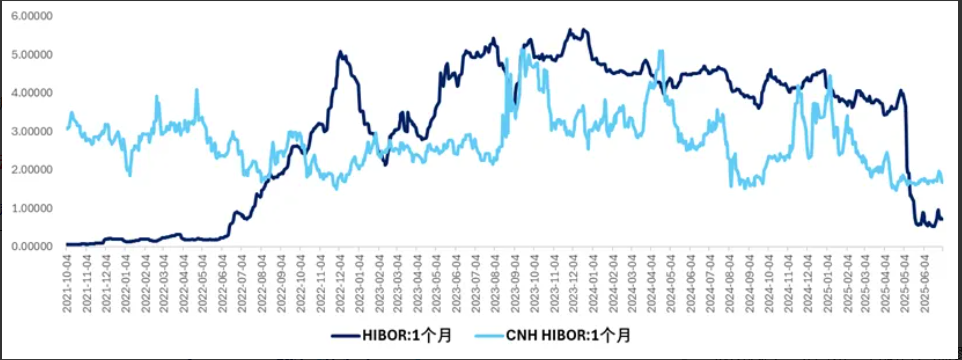 二季度以來香港新房銷售有所回升(數據來源:Wind,嵩山論市) 租賃市場同樣呈現復甦態勢。2025年5月私人住宅租金同比上漲2.74%,已連續26個月上漲,租金回報率回升至3.5%,顯著高於當前按揭利率2%,投資吸引力增強。租金的持續上漲不僅反映出住房需求的堅實基礎,也為房地產投資提供了穩定的現金流支撐。 不過,香港樓市復甦呈現明顯的區域分化趨勢。北部都會區受惠於政策傾斜和基建推進,新田科技城、洪水橋等新興片區開發加速,未來4-5年預計釋放約90萬套住宅供應。該區域人才流入顯著,2025年第一季度獲批人才簽證達2.7萬份,產業導入如數據中心和科創園區持續推進,有效抵消供應壓力,推動區域房價企穩。 相較之下,黃大仙區等傳統庫存積壓嚴重的區域,去化周期長達21個月,房價依舊承壓,表現較為疲軟。此類分化反映了市場對優質地段和新興區域的不同預期,結構性改善正在逐步展開。 政策“撤辣”效果逐步顯現 資金環境改善 HIBOR(香港銀行同業拆借利率)從2024年4月的3.65%驟降至2025年5月的0.57%,港元流動性充裕,銀行體系結餘高達1741億港元,融資成本明顯降低。金融管理局放寬按揭壓力測試,首套房貸款成數提升至七成,實際按揭利率降至1.8%-2%的歷史低位水平,極大緩解了購房者的資金壓力。 HIBOR的下行不僅降低了購房成本,也提升了開發商融資環境,淨負債率普遍改善。例如,恒基地產淨負債率同比下降8%,企業盈利修複空間打開。預計HIBOR年底雖可能回升至2.2%-2.8%,但仍低於過去高點,整體利率環境保持寬鬆,有助於保持市場流動性和資金活躍度。