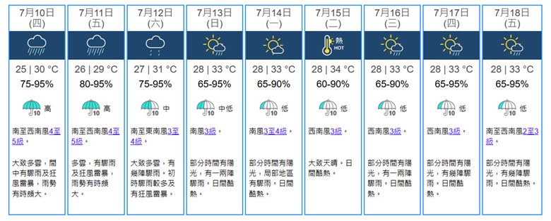 香港天文台在今晨(10日)8點45分繼續發出黃色暴雨警告,并在上午8點20分作出特別天氣提示:按照目前預測,丹娜絲的殘餘會在今日(10日)往西南方向移動,橫過廣東東部,隨後可能在廣州附近掠過,而南側的活躍西南季候風會在今明兩天(7月10日-11日)普遍影響珠江口一帶,預料本港會有暴雨及狂風雷暴。 同時,天文台還表示,會視乎本地風力變化,考慮發出強烈季候風信號。在暴雨及較強西南季候風的共同影響下,珠江口一帶的天氣會較為惡劣。市民請留意天文台的最新天氣預測及警告。