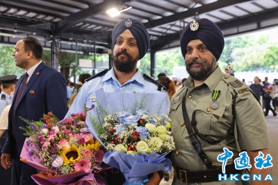 7月12日,香港警察學院舉行結業會操。圖為阿達和父親在結業會操後合影。(香港中通社記者 謝光磊 攝) 阿達實習時曾在8小時內處理3位非華裔人士的求助個案,過程中他以旁遮普語和印度語,與不諳英語的求助人交談,節省了翻譯的時間。他希望未來以非華裔身份,與同袍一起守護香港,服務市民,助警隊在處理非華裔人士個案時更加順利。 據阿達的家人所述,自上世紀70年代以來,錫克族裔就沒有人再加入過香港警隊,阿達成功投考警隊,成為家裡服務香港社會的第四代,具有特殊意義。(完) 【編輯:李冉】