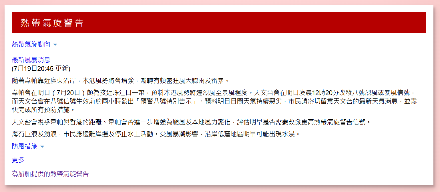 香港天文台凌晨12時20分發8號風球 最新安排一文看香港新聞網7月19日電 受颱風“韋帕”影響,三號強風信號現正生效, 據香港天文台消息,明日(20日)凌晨12時20分將改發八號烈風或暴風信號。