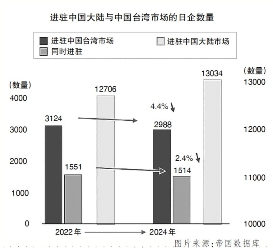 據日本帝國數據庫公佈的調查數據,截至2024年7月,日本企業進駐台灣地區數量為2988家,較兩年前減少136家,下降4.4%,而同期進駐中國大陸的日本企業數量卻從2022年的12706家增加到2024年的13034家,呈相反趨勢。