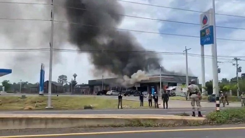 泰國一個加油站遭到柬埔寨炮擊。圖自社媒臉書 當天晚些時候,泰國第二軍區在社交媒體發文稱,上午10點58分許,泰軍已經出動F-16戰機執行空襲任務,并已安全返回。泰軍稱,空襲摧毀了柬軍第8和第9步兵旅指揮部。 針對柬埔寨媒體聲稱泰國皇家空軍F-16戰機於清晨被擊落的報道,泰國皇家空軍也在其官方臉書賬號發佈聲明稱,柬埔寨媒體的說法完全不屬實。