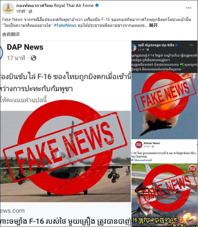 泰國皇家空軍闢謠。社媒臉書截圖 另一方面,柬埔寨國防部發言人則稱,由於泰國軍隊的“無故入侵”,柬埔寨軍隊進行了“自衛反擊”。 柬埔寨國防部通過一份發表聲明,指責泰國部署了過多的部隊,使用重型武器并進行空襲,試圖強行奪取柬埔寨領土。 柬埔寨人民黨主席、前首相洪森當天在社交媒體臉書上稱,柬埔寨兩個省份遭到了泰軍炮擊。而泰國代理總理普坦則表示,當前局勢“微妙”,他告訴記者:“我們必須小心謹慎,我們將遵守國際法。” 從目前披露的衝突畫面來看,雙方目前已經投入了包括122毫米多管火箭炮、F-16戰機在內的多型重裝備,同時雙方的一線地面部隊也以互相射擊的形式展開交火。雙方的攻擊在打擊對方的軍事力量的同時也造成了平民傷亡,但雙方目前都沒有調動更大規模部隊發動地面進攻,奪取對方大片領土的跡象。