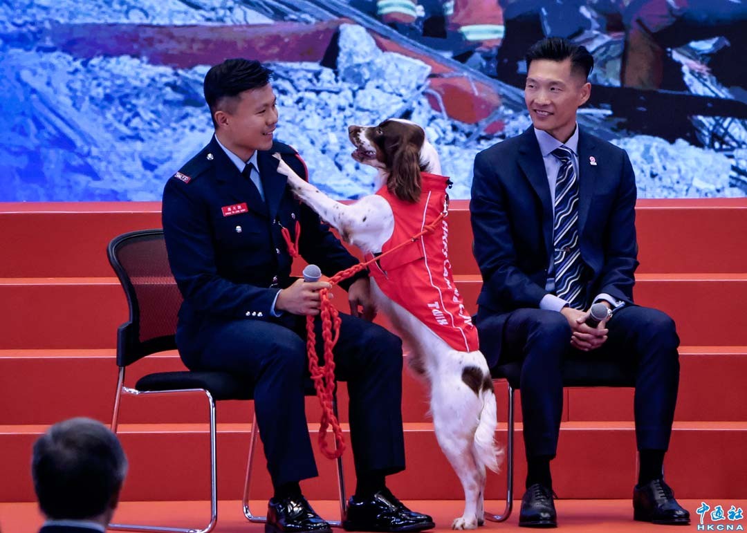 7月23日,香港舉行“行政長官表揚榜”頒獎典禮,得獎隊伍為“2025年3月前赴緬甸地震災區救援的特區救援隊”及“啟德體育園開幕跨部門籌備專組”。圖為搜救犬Twix隨隊參與救災,也受到表彰。(香港中通社記者 謝光磊攝)