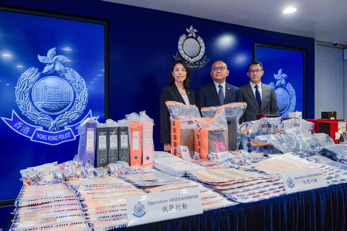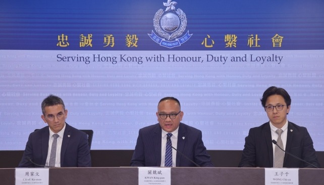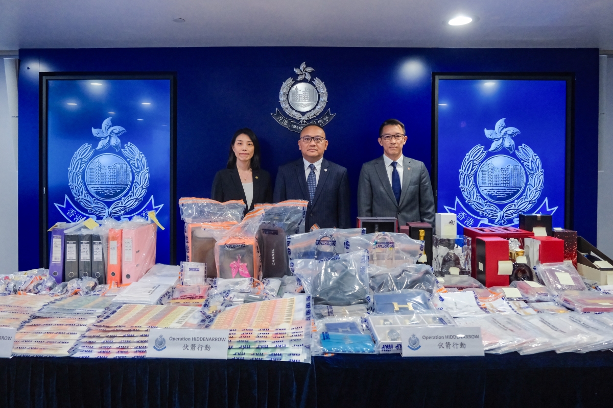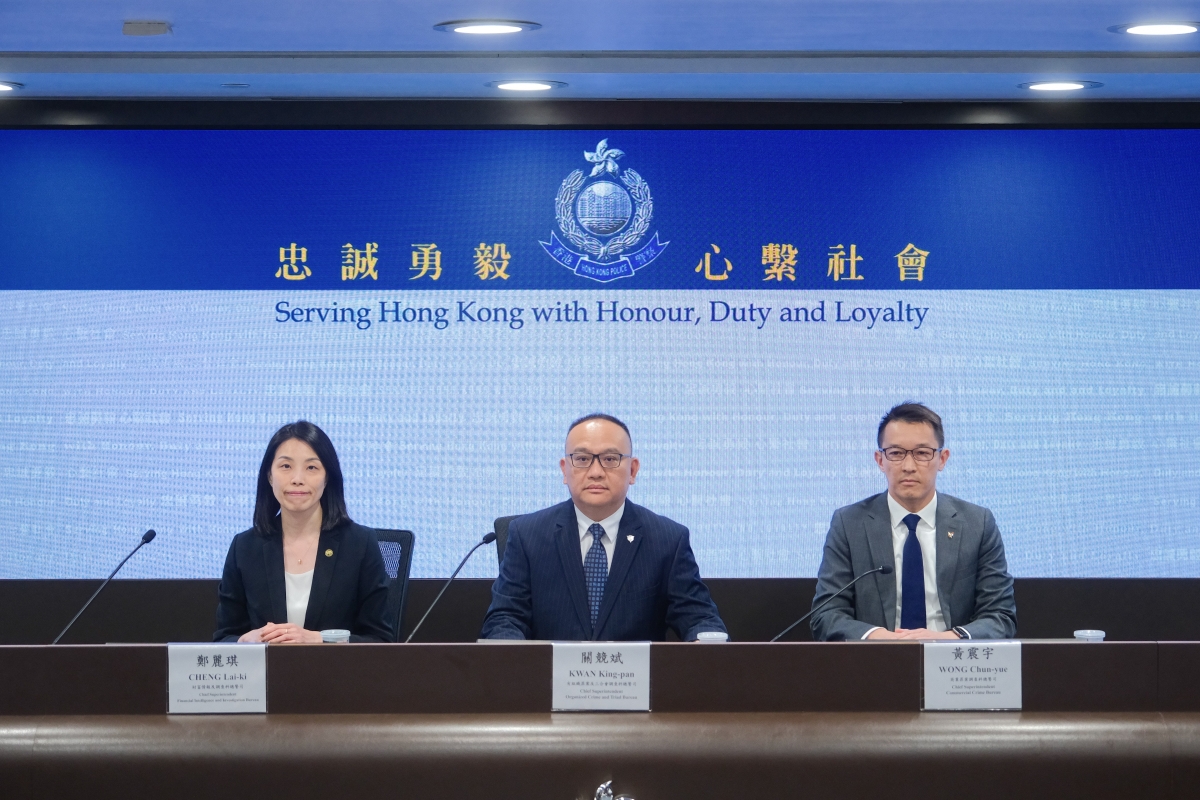 有組織罪案及三合會調查科總警司關競斌(中)、商業罪案調查科總警司黃震宇(右)和財富情報及調查科總警司鄭麗琪(左)出席記者會。