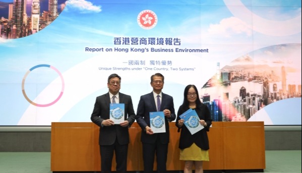 有組織罪案及三合會調查科總警司關競斌(中)、商業罪案調查科總警司黃震宇(右)和財富情報及調查科總警司鄭麗琪(左)簡報案情。