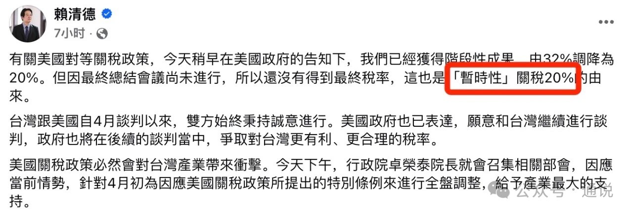 對此,台灣當局領導人賴清德發文“挽尊”,稱20%是“暫時性”關稅,後續再談可望再調降稅率。綠委也口徑一致強調關稅“暫時性”。