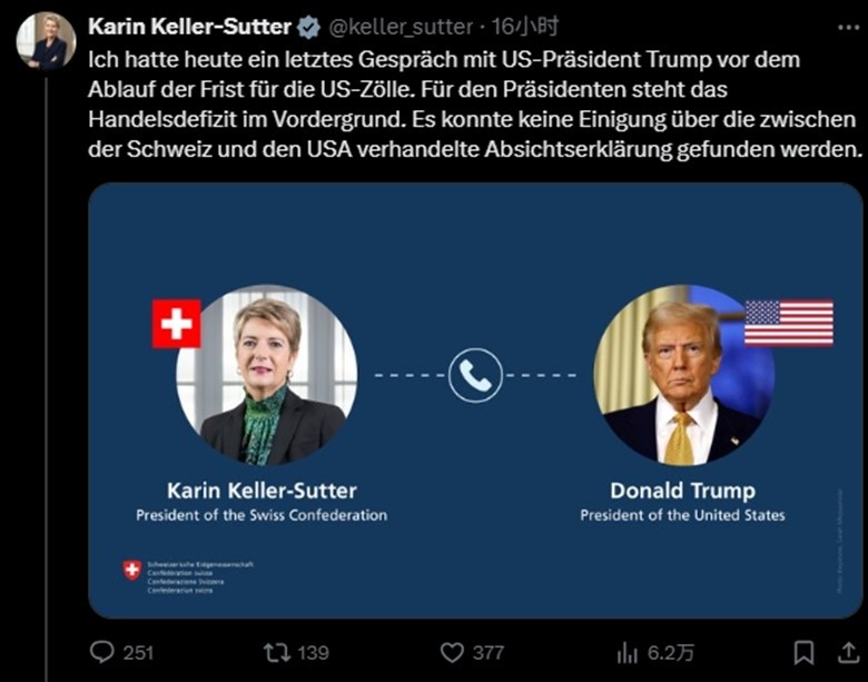 瑞士聯邦主席凱勒-祖特爾在X平台發佈聲明 瑞士外交部長伊格納齊奧·卡西斯表示:“我們不會氣餒,將繼續為達成符合雙方利益的協議而努力。” 據報道,特朗普此舉還激怒了一向溫和的瑞士政黨。瑞士主要政黨之一自由黨表示:“通過這一決定,美國不僅破壞了與我們國家數十年的良好關係,也破壞了整個自由貿易。” 一名瑞士議員稱,“美國到底想要我們做什麼,目前還不清楚”,政府目前處於“震驚狀態”。 據一位知情人士透露,瑞士談判代表對最新聲明感到措手不及,因為他們此前已收到來自多名美國高級官員的“令人鼓舞的信號”。該人士補充說,他們計劃繼續與美國談判,并仍希望達成降低關稅的協議。 報道稱,幾周前,瑞士向美國提交了貿易協議提案。瑞士方面曾樂觀認為,該國可能成為首批與華盛頓達成貿易協議的國家之一,然而結果令人意外。 瑞士各行各業均“目瞪口呆” 7月31日,瑞士人開始國慶假期,迎接國慶日慶祝活動。但就在這一天,他們迎來了來自大洋彼岸的“噩耗”:8月7日起,瑞士多行業將面臨來自美國的39%高額關稅。 外媒紛紛關注,39%的稅率超過歐盟大多數輸美產品15%關稅的兩倍有餘。 據報道,這一稅率高於特朗普最初在威脅的31%,使瑞士成為歐洲的例外國家。相比之下,英國對美出口商品的關稅稅率為10%,歐盟為15%。同樣是非歐盟歐洲國家的挪威,稅率也與歐盟27國相同,為15%。瑞士與歐盟保持著緊密的經濟和政治聯繫,但仍固守所謂“中立國”身份,拒絕加入歐盟。 “最可能的原因是2024年瑞士對美貿易順差激增,”瑞士洛桑IMD商學院教授西蒙·埃文尼特表示,“2024年,瑞士對美商品貿易順差較2023年增長了56%。” 這個擁有900萬人口的國家主要出口藥品、奢侈品、機械和黃金,與美國的貿易不平衡現象較為嚴重。 數據顯示,2024年,兩國間雙向貿易額達884億美元,瑞士對美出口商品總值達609億美元,主要包括製藥產品、醫療設備、咖啡、手錶和黃金。今年,兩國間貿易逆差因藥品和黃金進口激增而加劇。