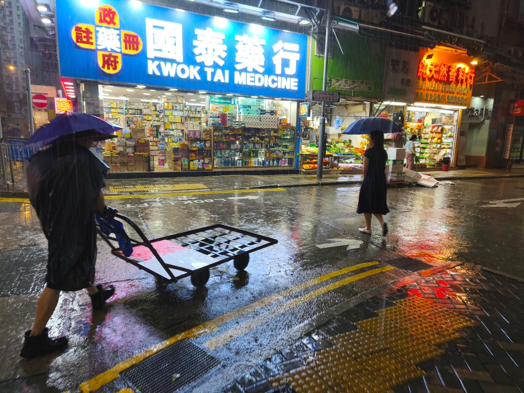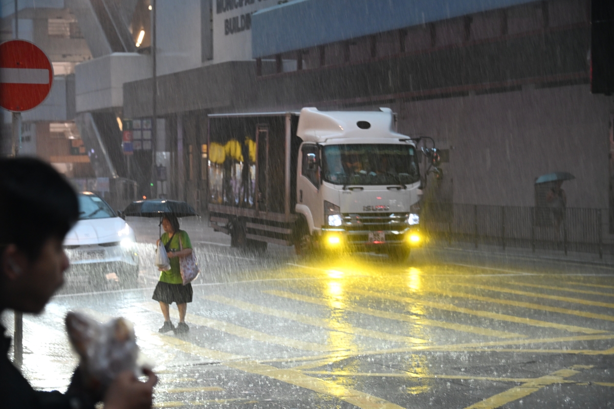 市區雷雨交加,白日變黑晝。市民出外舉步維艱。