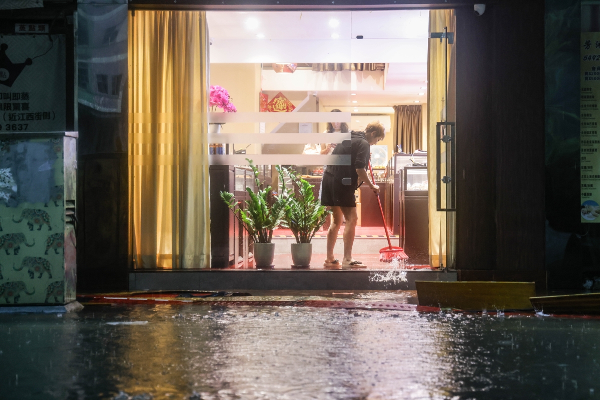 土瓜灣一條道路發生水浸,有商戶正清理店鋪內積水。