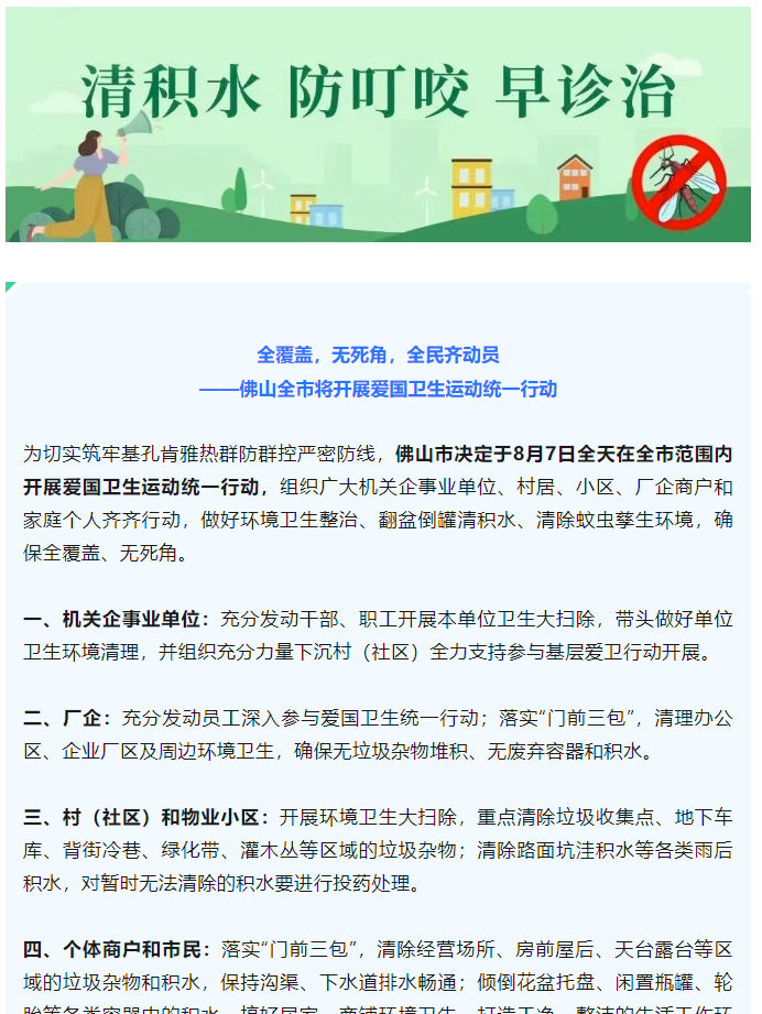 微信公眾號“佛山發布”8月6日發布消息,佛山市決定於7日全天在全市範圍內開展愛國衛生運動統一行動 佛山市決定組織廣大機關企事業單位、村居、小區、廠企商戶和家庭個人齊齊行動,做好環境衛生整治、翻盆倒罐清積水、清除蚊蟲孳生環境,確保全覆蓋、無死角。