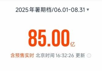 香港新聞網8月11日電 據網絡平台數據,截至8月10日16時32分,2025年暑期檔(6月—8月)電影總票房(含預售)突破85億。