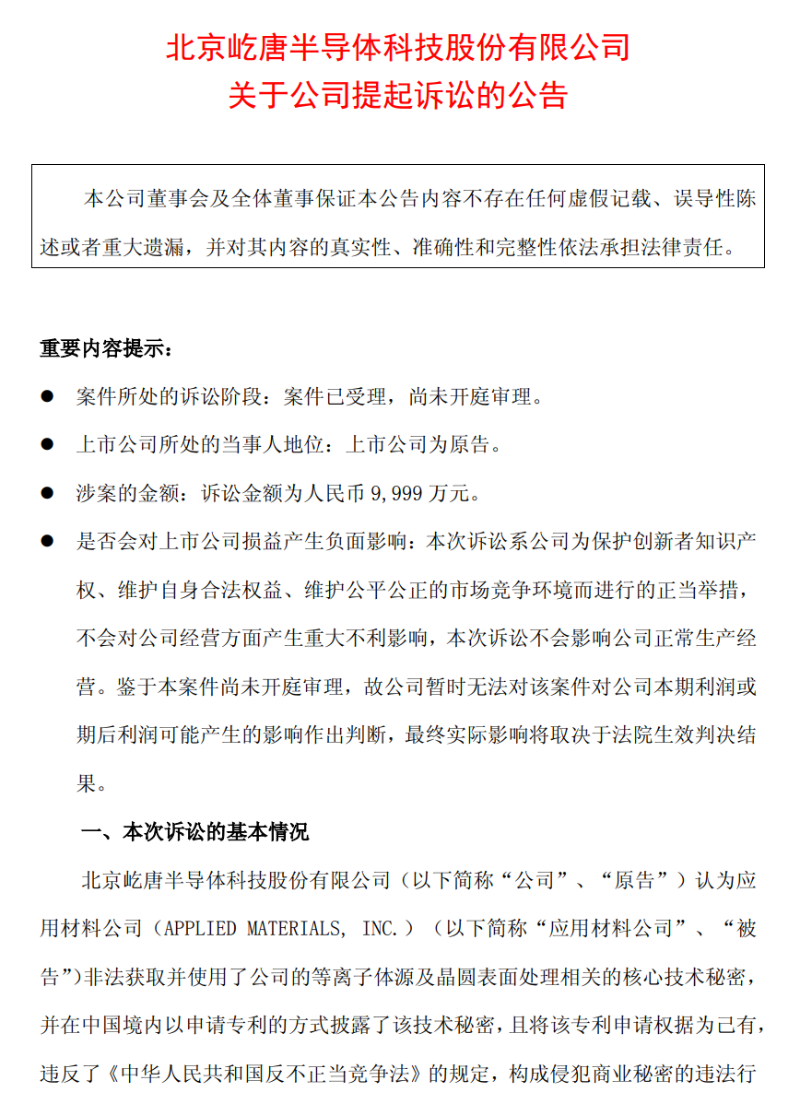 北京屹唐半導體科技股份有限公司(屹唐股份)13日晚間公告 據公告,屹唐股份認為應用材料公司非法獲取並使用了屹唐股份等離子體源及晶圓表面處理相關的核心技術秘密,並在中國境內以申請專利的方式披露了該技術秘密,且將該專利申請權據為己有,構成侵犯商業秘密的違法行為,對屹唐股份知識產權和經濟利益造成嚴重的損害。 屹唐股份就該事項向北京知識產權法院提起訴訟,並於近日收到法院出具的《民事案件受理及舉證通知書》等相關材料,訴訟金額為9999萬元人民幣。 公告還表示,截至本公告披露日,該案件已立案,尚未開庭審理。 公開資料顯示,屹唐股份成立於2015年底,目前已是中國半導體設備龍頭企業,主營業務為集成電路製造過程中所需晶圓加工設備的研發、生產和銷售。今年7月8日,屹唐股份正式登陸上海證券交易所科創板。 應用材料公司是美國一家老牌半導體和顯示設備製造商,1984年成為第一家進入中國市場的國際芯片製造設備企業。(完) 【編輯:彭玉婷】