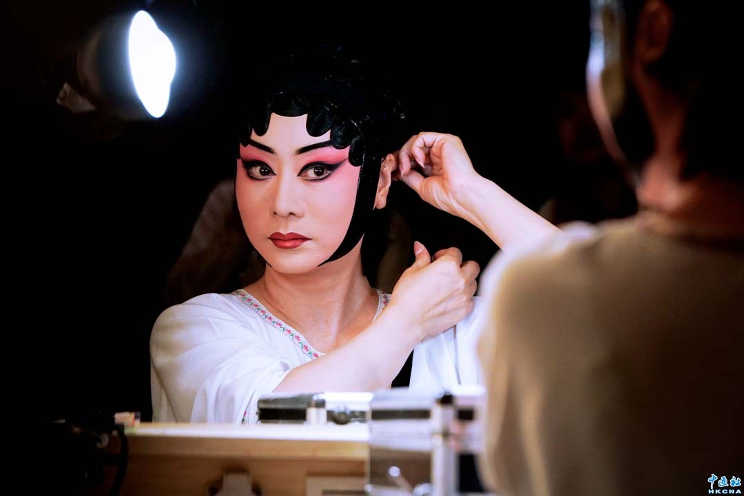 中國戲曲學院名家、教授等80人,8月12日至17日在台灣台北戲劇院登台。台灣雖然遭逢颱風“楊柳”侵襲,但是演出如常進行,團員們在演出前也毫不鬆懈,加緊練習,為演出做好準備。圖為中國戲曲學院名家李勝素在《鳳還巢》的化妝雍容華貴。 香港中通社圖片