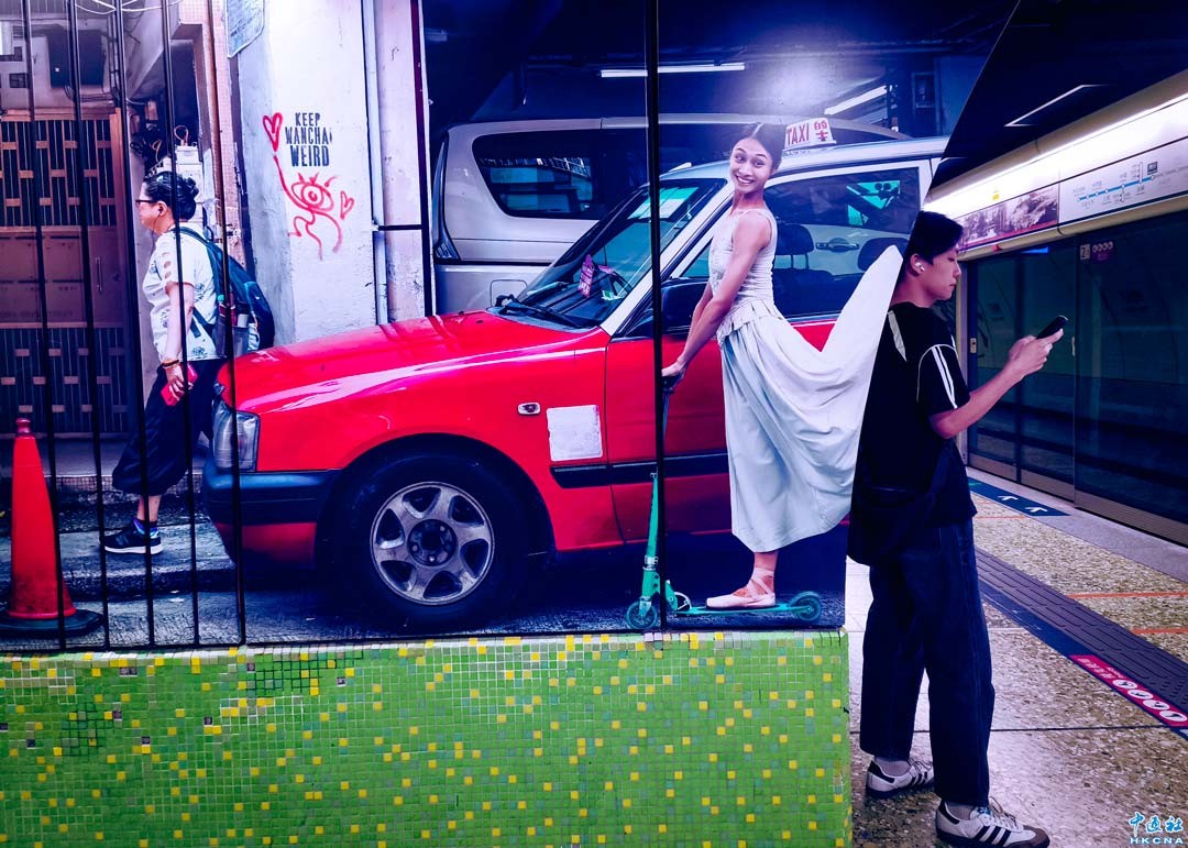 香港灣仔地鐵站的壁畫,為往來的乘客帶來視覺的享受。大型壁畫展示了香港芭蕾舞團團員與灣仔街道的互動,並記錄了日常生活中的動態。 這些作品旨在通過舞蹈和城市景象的結合,重新定義都市空間和灣仔的風情。 (香港中通社記者 洪少葵攝)
