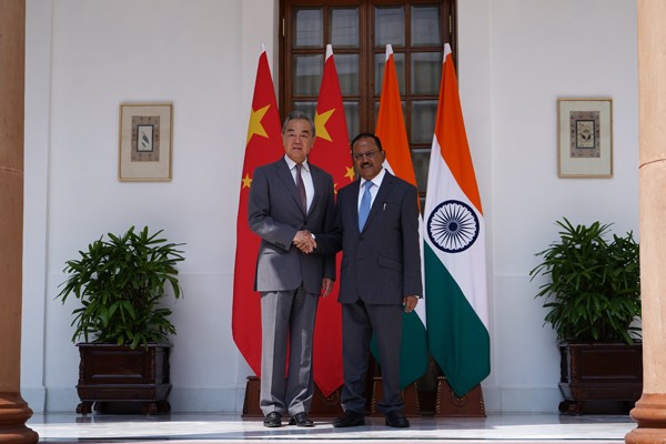 中共中央政治局委員、中央外辦主任王毅(左)同印度國家安全顧問多瓦爾 圖片來源:中國外交部網站 王毅表示,今年以來,中印雙邊關係進入穩步發展軌道,邊境局勢持續穩定向好。 他強調,中印雙方應按照兩國領導人戰略指引,秉持雙軌並進、相互促進、良性循環的思路看待和處理雙邊關係和邊界問題,通過對話溝通增進互信,擴大交流合作,共同推動在邊境管控、劃界談判、跨境交流等方面匯聚共識、明確方向、設定目標,妥善解決具體問題,取得更多積極進展,為兩國關係改善發展不斷營造有利條件。