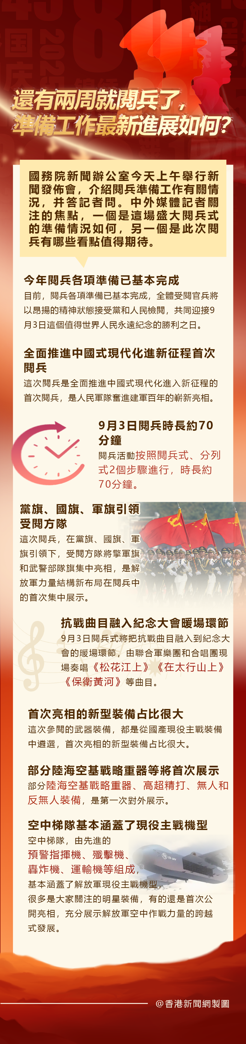 香港新聞網8月20日電 國務院新聞辦公室今天(8月20日)上午舉行新聞發佈會,介紹閱兵準備工作有關情況,并答記者問。中外媒體記者關注的焦點,一個是這場盛大閱兵式的準備情況如何,另一個是此次閱兵有哪些看點值得期待。