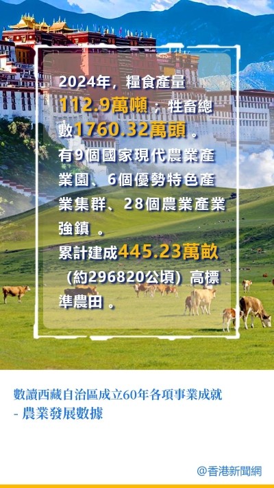 (三)農業設施與產業 1. 1952年:使用木犁耕地,鐵製農具未普及 。 2. 現在:有9個國家現代農業產業園、6個優勢特色產業集群、28個農業產業強鎮 。 3. 2024年:累計建成445.23萬畝(約296820公頃)高標準農田 。 當前,西藏清潔能源、文化旅遊、綠色工業等九大產業蓬勃發展,現代產業體系初步建立,主要經濟指標增速連續多年位居全國前列。經濟的發展,為改善民生、滿足人民對美好生活的嚮往提供了堅實的物質保障。 如今的西藏:人民生活水平顯著提高、教育事業優先發展、城鄉公共醫療衛生服務體系不斷完善、多層次社會保障體系基本建成,雪域高原正以蓬勃之姿邁向更加輝煌的明天。 文字收集整理:香港新聞網 製圖:蘇淳淳 (完) 【編輯:錢林霞】
