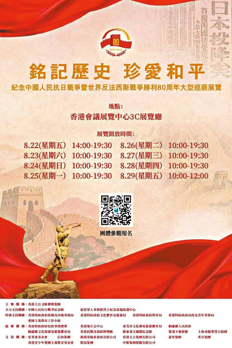 “銘記歷史 珍愛和平” 抗戰勝利80周年特展今日開鑼香港新聞網8月22日電 由香港大公文匯傳媒集團主辦的“銘記歷史 珍愛和平──紀念中國人民抗日戰爭暨世界反法西斯戰爭勝利80周年大型巡迴展覽”今日(22日)在灣仔會展拉開序幕,一連8天的展期,觀眾可以欣賞到近570張珍貴圖片,近5萬字的文字資料,現場亦設有多重互動體驗,以多媒體沉浸式佈展形式及實物展示,讓抗日烽煙中那些可歌可泣的真實故事重現眼前。據了解,截至昨日,已有285個團體報名觀展,累計8609報名人次。