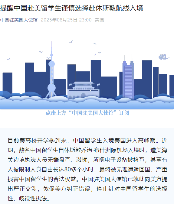 香港中通社8月26日電 近期,多名中國留學生在休斯敦喬治·布什洲際機場入境時,遭到美國海關邊境執法人員無端盤查、滋擾,電子設備被檢查,甚至有人被限制人身自由長達80多小時,最終被無理遣返。對此,中國駐美國大使館已就此向美方提出嚴正交涉,敦促糾正錯誤,停止針對中國留學生的選擇性、歧視性執法。