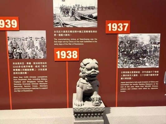 圖源:政府新聞處 是次展覽共展出183件抗戰文物,包括82件來自中國國家博物館的藏品,當中8件展品是國家一級文物。中國國家博物館黨委書記楊帆表示,展覽緊扣“萬眾一心 維護和平”主題,摒棄“湊數”思維,每一件展品都承載著獨特的歷史敘事價值。 此外,國家博物館聚焦選取有視覺表現力的文物,在同類文物中,優先選取大尺寸、富空間感的藏品,直觀展現歷史場景的壯闊與厚重,打破展品“扁平化”帶來的局限。 踏入展館,右手邊便是盧溝橋上雕刻的石獅子。在這座“盧溝橋”一側的牆壁上,亦有光影營造出的游擊隊剪影穿梭,令人聯想到1937年7月7日抗日戰爭全面爆發的起點“七七事變”。