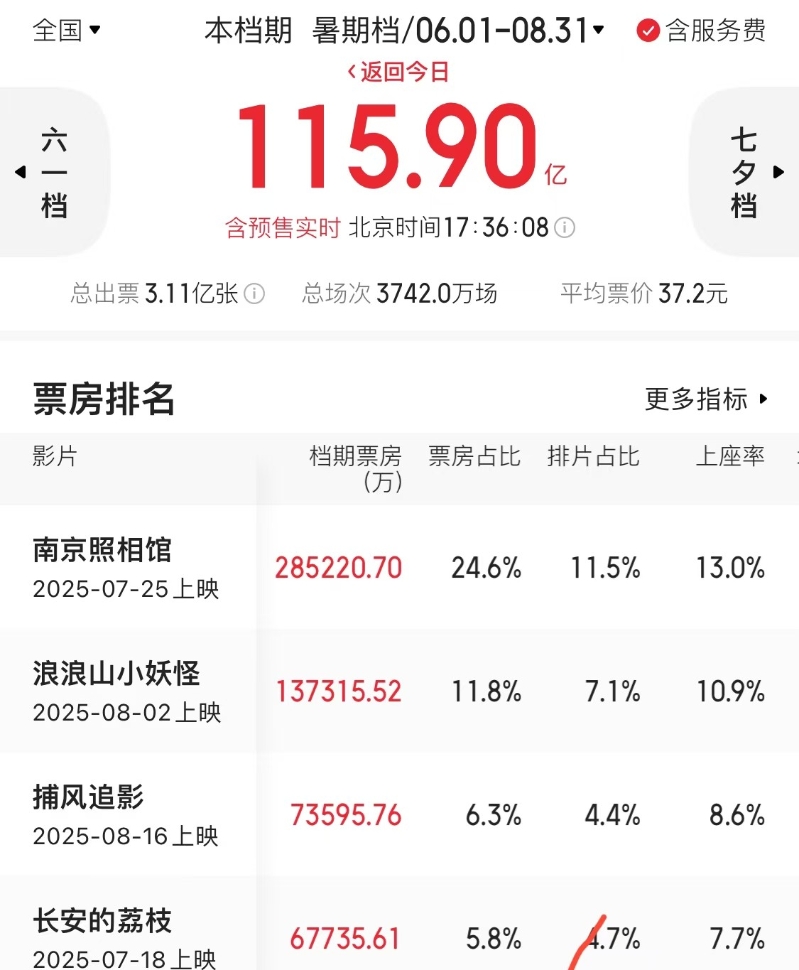 圖源:貓眼專業版截圖 影片《南京照相館》位居票房榜首,7月25日上映以來,總票房已破28億,刷新中國影史暑期檔歷史片票房紀錄。 影片《浪浪山小妖怪》位列第二名,目前累計票房突破13億。它將傳統IP進行了全新演繹,成為中國影史動畫電影票房榜第八名,刷新中國影史二維動畫電影票房紀錄。 影片《捕風追影》口碑也一路走高,票房已破7億元。